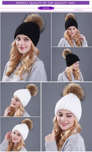 Women's fox fur ball cap pom poms winter hat knitted beanies cap