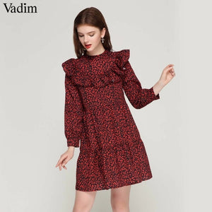 Women Vintage Leopard Sweet Ruffles Long Sleeve O Neck Pleated Casual Straight